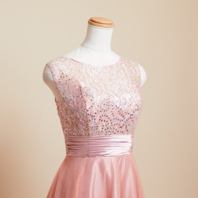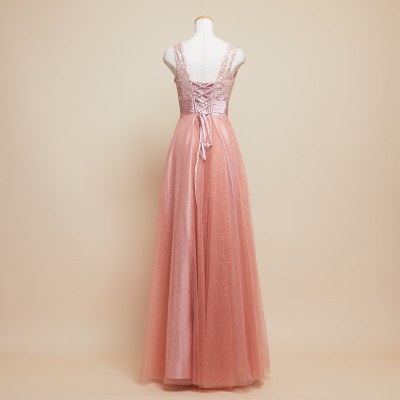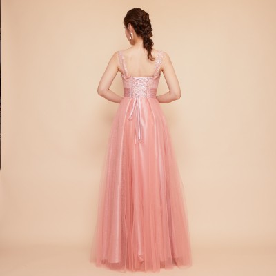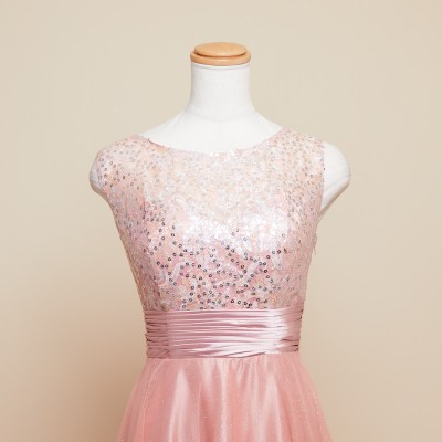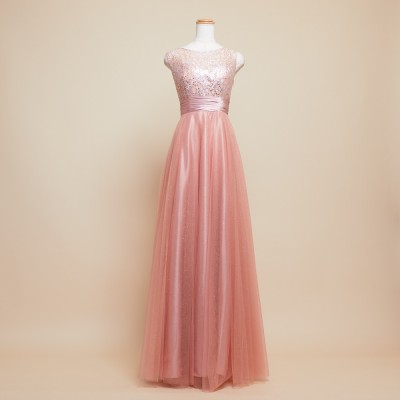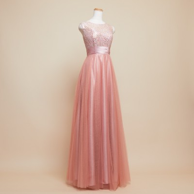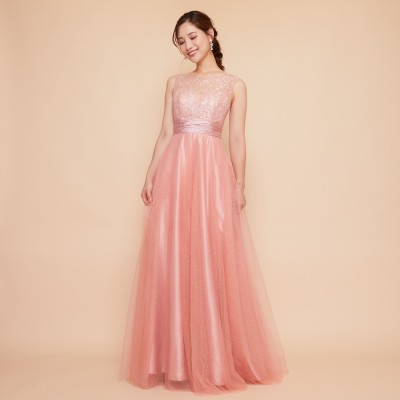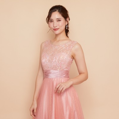愛くるしいピーチオレンジカラーのスレンダースタイルドレス。鮮やか過ぎないペールトーンなので、キュートさを残しつつも大人な雰囲気に。柔らかなチュールスカートにちりばめられた微小なグリッターの繊細な輝きと、身頃のスパンコール刺繍レースの煌めきがとても優雅です。ウエストの幅広サテンギャザーが身頃をコンパクトに見せるのでスタイルアップ効果も期待できます。