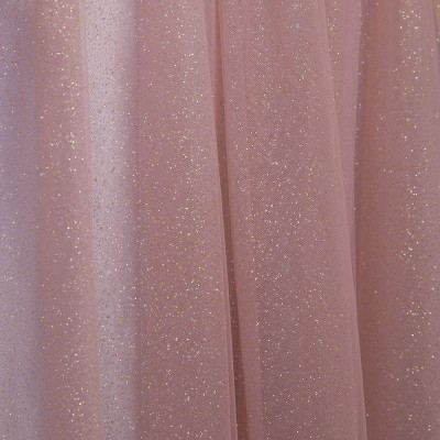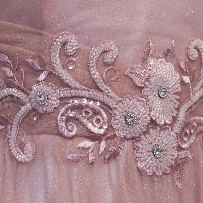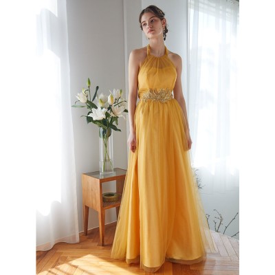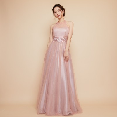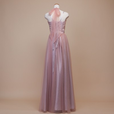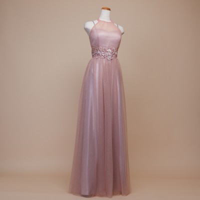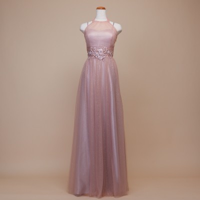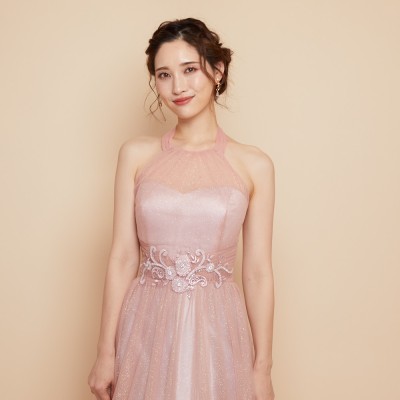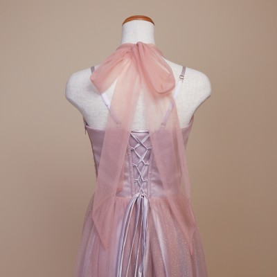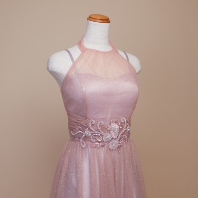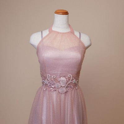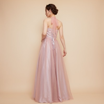 アンティークドレスのような落ち着きある上品なくすみ系ピンクローズカラーのホルターネックスタイルグリッターチュールドレス。全体に散らした微細なゴールドグリッターの輝きがとてもエレガント。大人っぽい雰囲気になりがちなホルターネックスタイルに、ふんわりエアリーな遊び心ある可愛らしいリボン結びデザインを取り入れました。体形や姿勢に合わせて首元のリボンを調整すれば、どなたでも着用しやすいサイズ感でお召しいただけます。