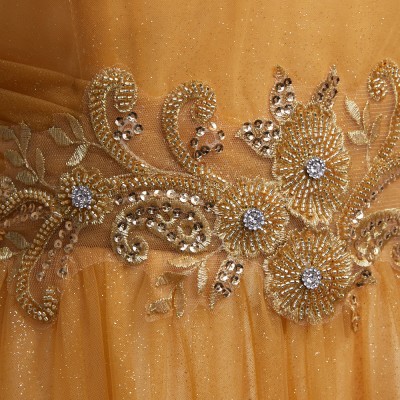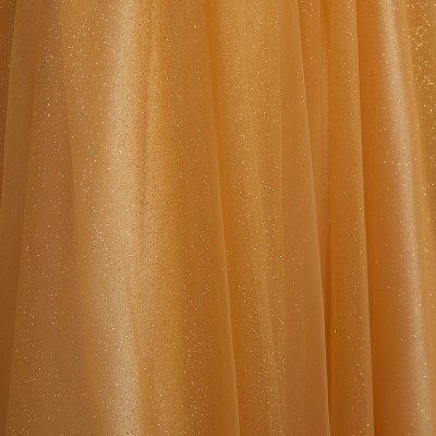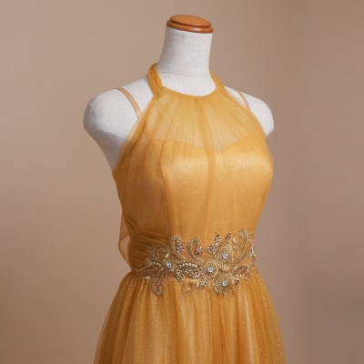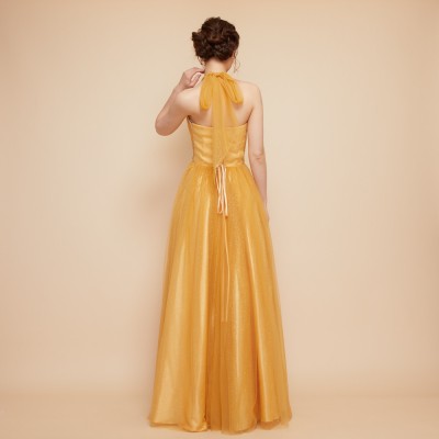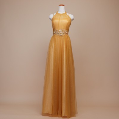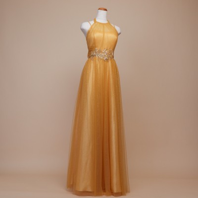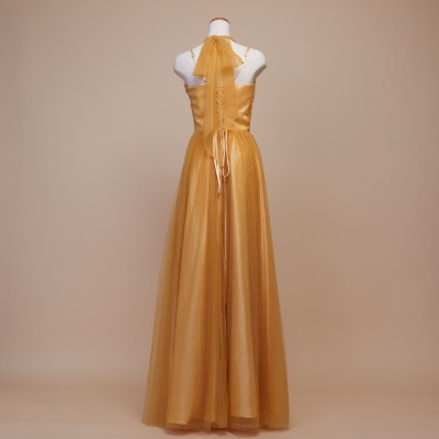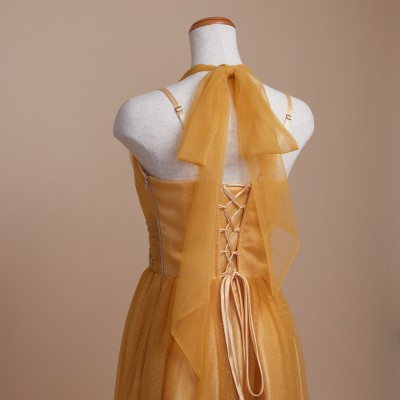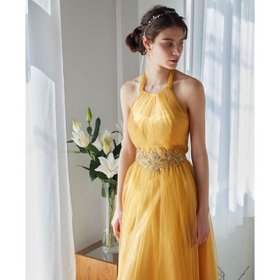 甘くとろける黄金色の蜂蜜を思わせるハニーイエローカラーのホルターネックスタイルグリッターチュールドレス。全体に散らした微細なゴールドグリッターの輝きがとてもエレガント。大人っぽい雰囲気になりがちなホルターネックスタイルに、ふんわりエアリーな遊び心ある可愛らしいリボン結びデザインを取り入れました。体形や姿勢に合わせて首元のリボンを調整すれば、どなたでも着用しやすいサイズ感でお召しいただけます。