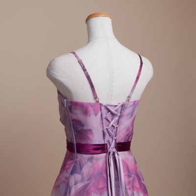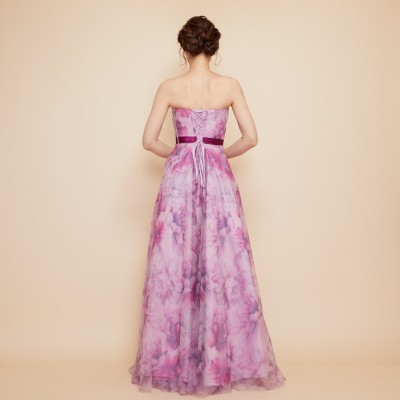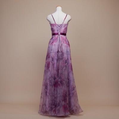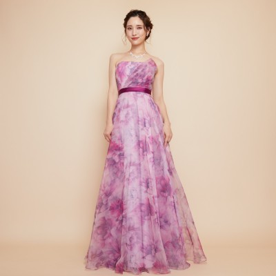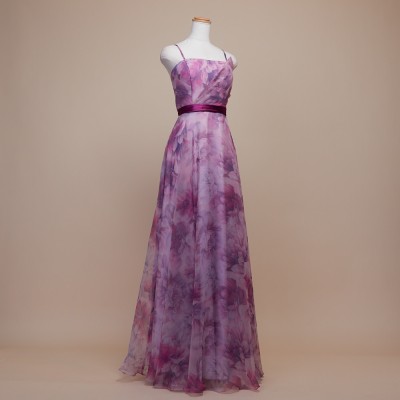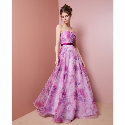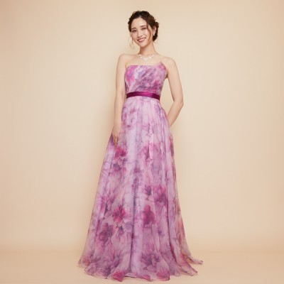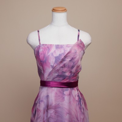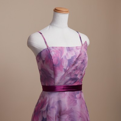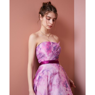 シルキーな艶ありオーガンジーに、水彩画のように儚いピンク系カラーのフラワープリントを施したシンプルAラインドレス。そよ風に揺らめく花々のように、動くたびひらりと軽やかに広がるフレアスカートがとても可憐なデザインです。