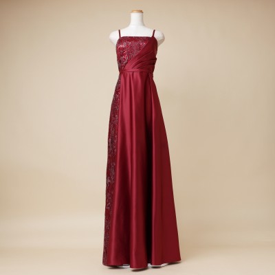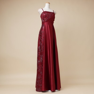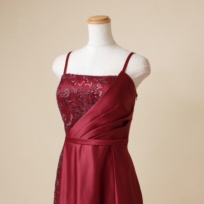 落ち着きあるマットな生地感の中に、美しく浮かび上がるデザインスパンコール生地をポイント使いしたハイセンスなステージドレス。主張し過ぎない程よい華やかさがとても魅力的です。パニエを使用してスカートデザインを生かした着こなしもおすすめ。大人の女性にぴったりな品あるワインカラー。
