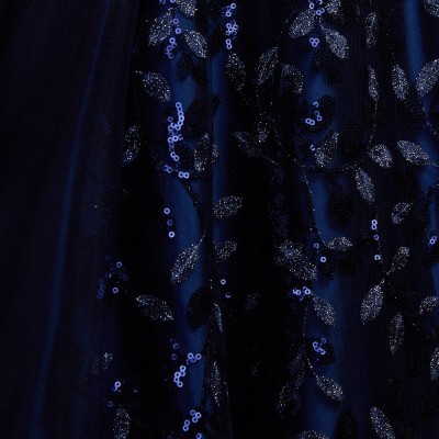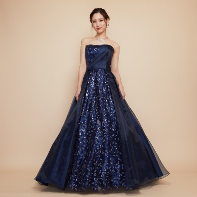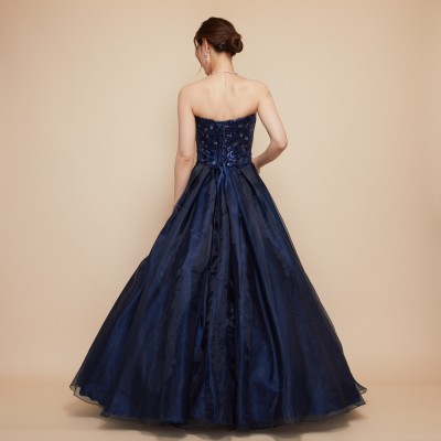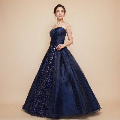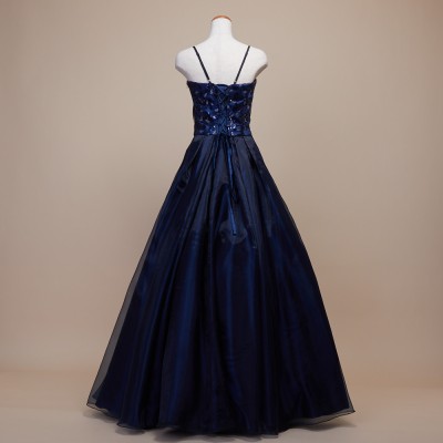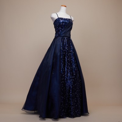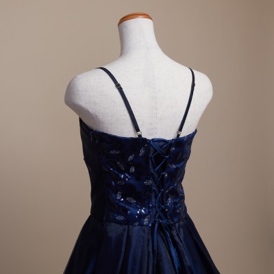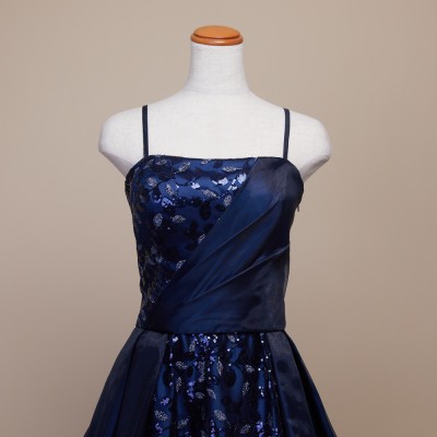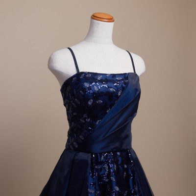 大きく軽やかに広がるボリュームオーガンジースカートに、リーフを模ったスパンコール装飾生地をフロントにあしらった豪華なステージドレス。オーガンジー特有の艶めく光沢とスパンコールの煌めきがとても華やかな雰囲気です。初々しい印象の少しダークなネイビーカラー。