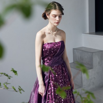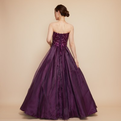 大きく軽やかに広がるボリュームオーガンジースカートに、リーフを模ったスパンコール装飾生地をフロントにあしらった豪華なステージドレス。オーガンジー特有の艶めく光沢とスパンコールの煌めきがとても華やかでな雰囲気に。大人の女性によく似合う、高貴なパープルカラー。