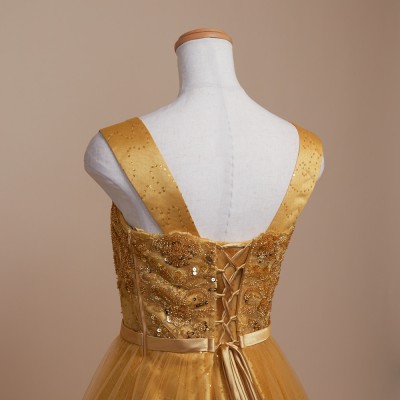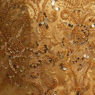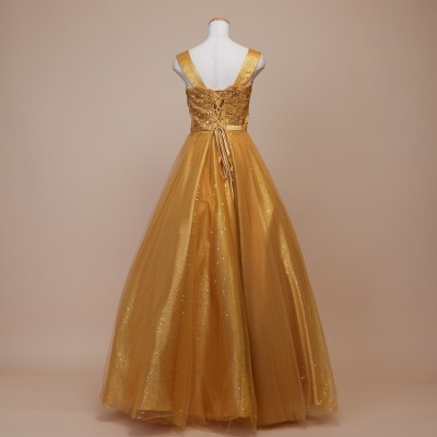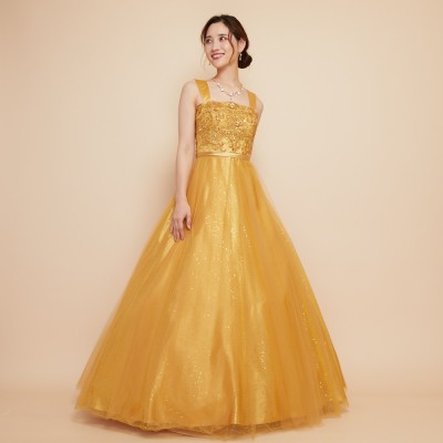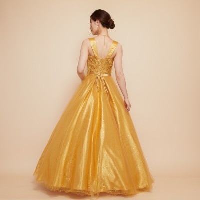 スカラップレースビーズ刺繍イエローゴールドチュールドレス