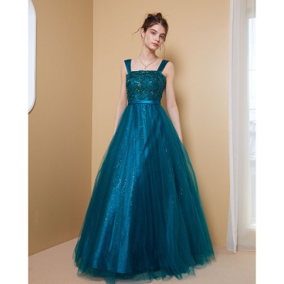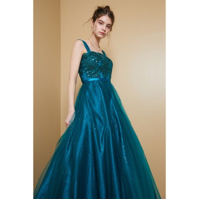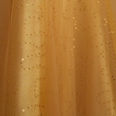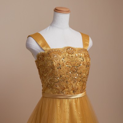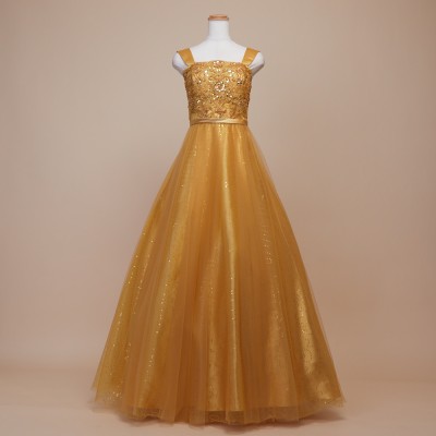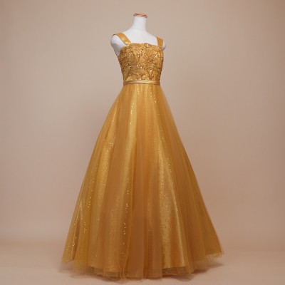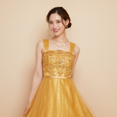 胸元のスカラップレース装飾に細やかなデザインのビーズ刺繍を施したボリュームチュールドレス。スカートのチュールにはスパンコール装飾生地を合わせ、ドレス全体をどこから見てもキラキラと光る華やかさが魅力です。高級感を際立たせるイエローゴールドカラー。