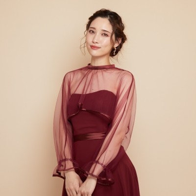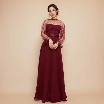 シンプルなスレンダーシフォンドレスに、トレンドのシアーチュール素材ボレロを合わせたレディライクな一着。淑女にふさわしく品よく着こなせるデザインです。落ち着いたワインカラーはより一層女性らしさを引き立たせます。