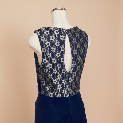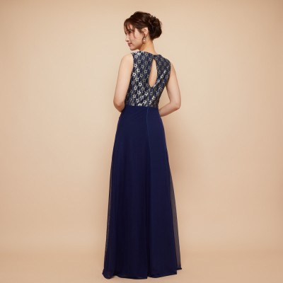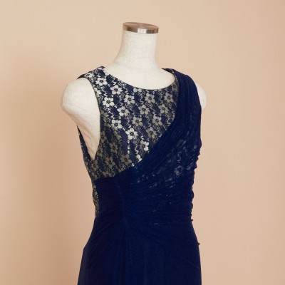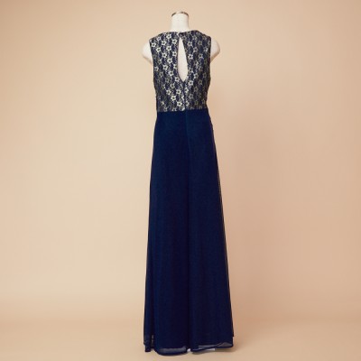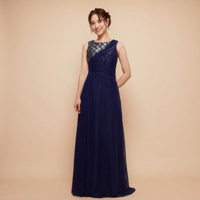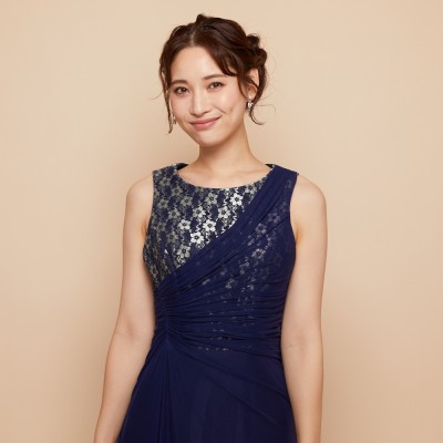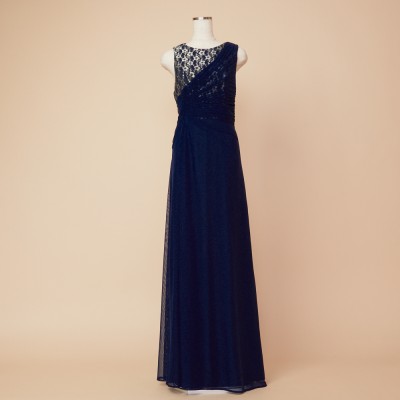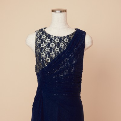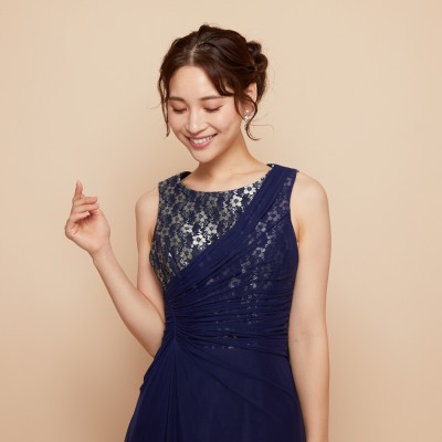 華やかなフラワーレースがのぞく胸元から、流れるようにドレープをかけウエストラインがすっきりと見えるデザインに。シワになりにくい素材なので、長期のクルーズパーティ用ドレスとしてもおすすめです。フラワーレースが映えるネイビーブルーカラー。