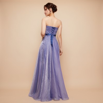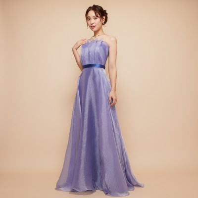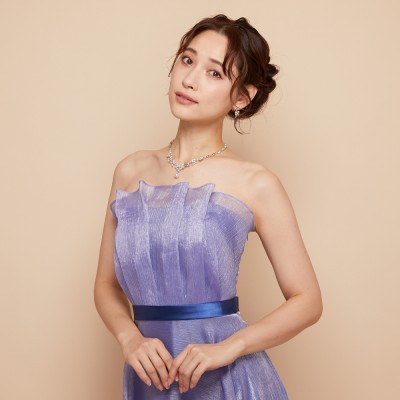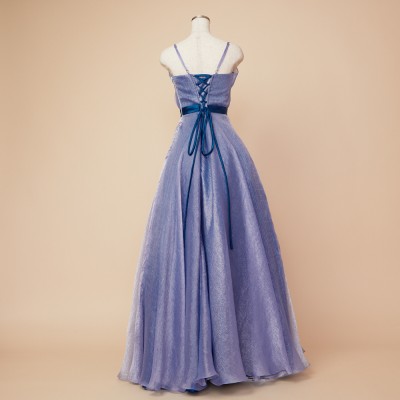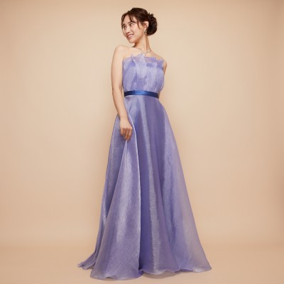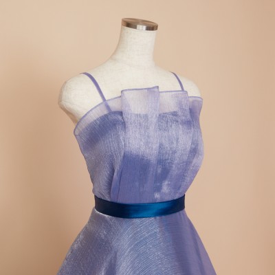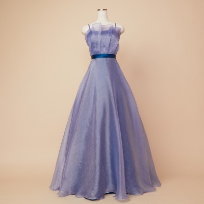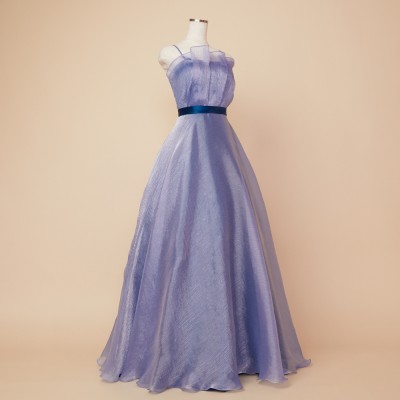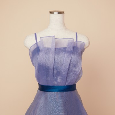 透明感あるオーガンジー生地にワッシャー加工を施した少し個性的な印象のフレアスタイルドレス。顔周りを可愛らしく華やかに見せる胸元のフリルがデザインのポイント。パニエを使用してふんわり可愛らしくスカートを広げる着こなしもおすすめです。大人っぽいイメージで着用出来るスモーキーブルーカラー。