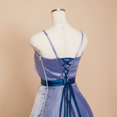 ブルーワッシャーオーガンジー胸元フリルフレアドレス