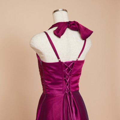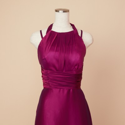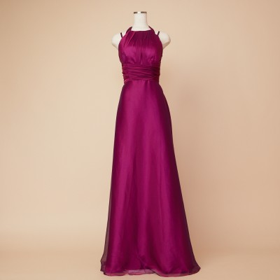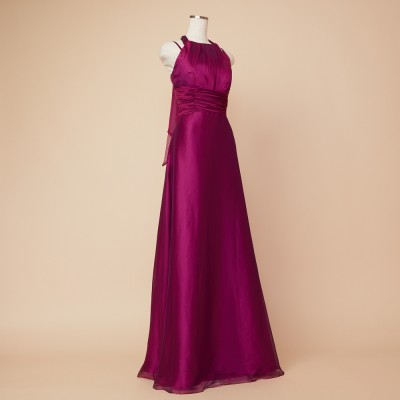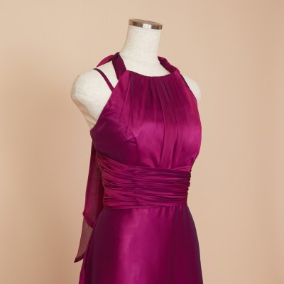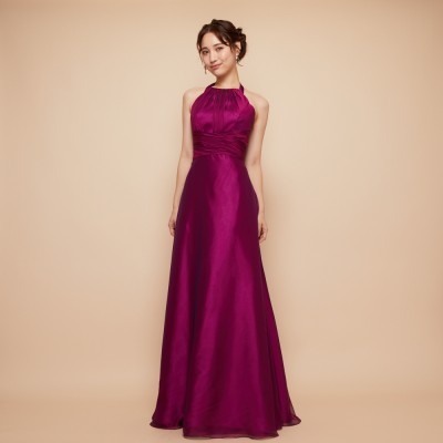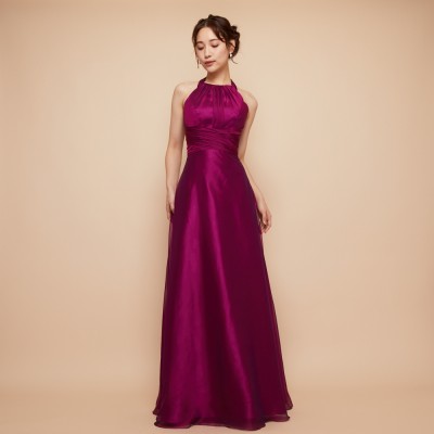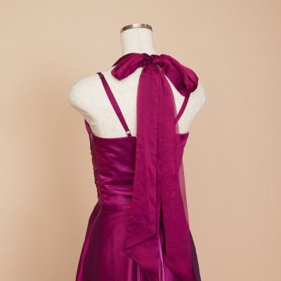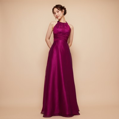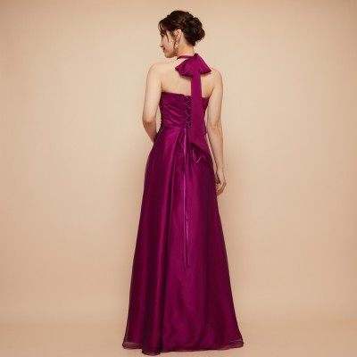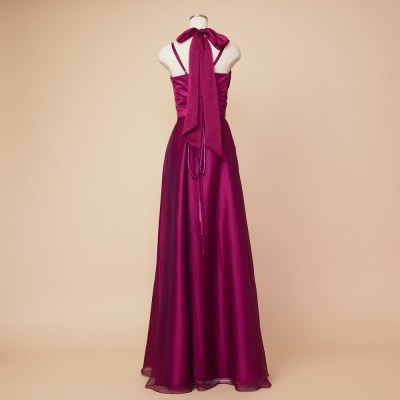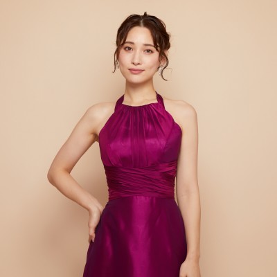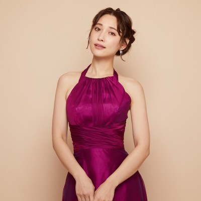 さらりとした繊細なオーロラカラーシフォンを纏ったホルターネックスタイルドレス。見る角度によって色が変わる儚げな印象に、ふんわりと首後ろでリボンを結む大人可愛いデザインが魅力です。胸元にも裏地があるので透けない安心仕様。華やかで大人な印象のレッドパープルカラー。