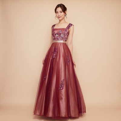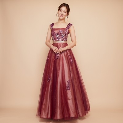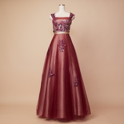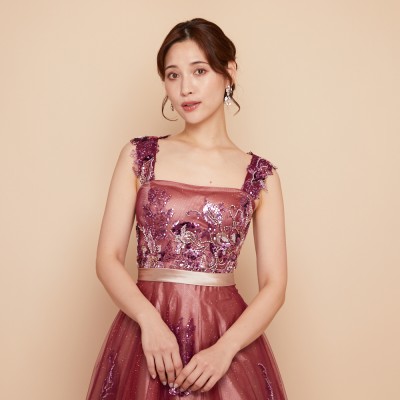 豪華な立体ビーズ刺繍を贅沢に施したプラムレッドカラーのグリッターチュールドレスです。ゴールドカラーのサテン生地の上にプラムレッドカラーチュールを重ねた、エスニックスタイルのグラデーションカラーが魅力。取り外し可能な肩紐にも華やかなビーズ刺繍を乗せたとっても華やかなデザインです。
