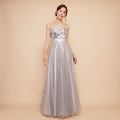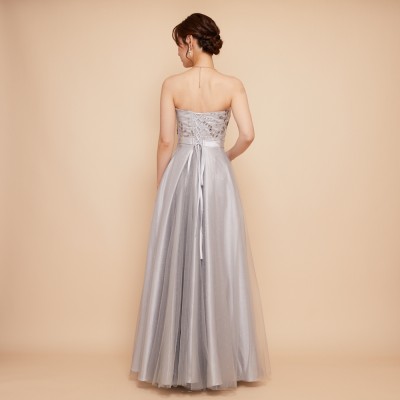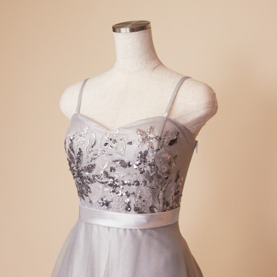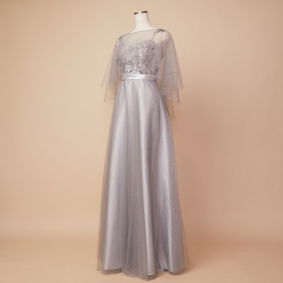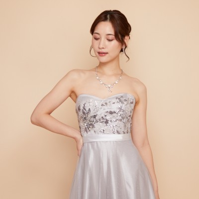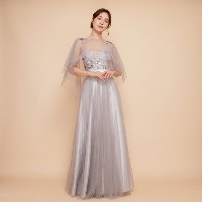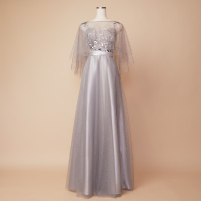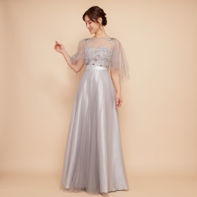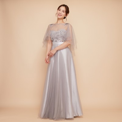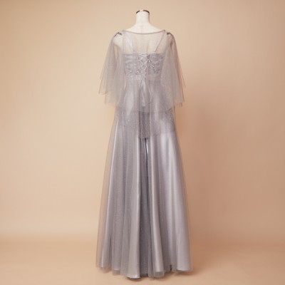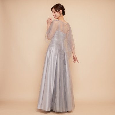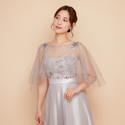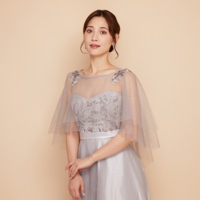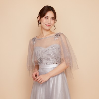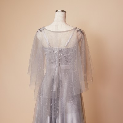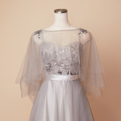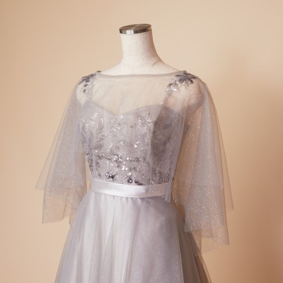 気になる露出を抑えるアシンメトリーデザインケープを羽織る、クールで上品なシルバーカラーのグリッターチュールドレス。