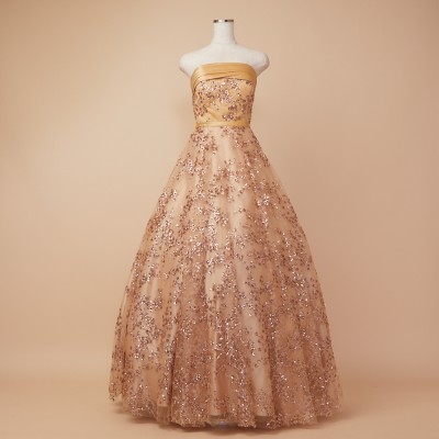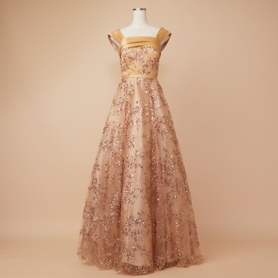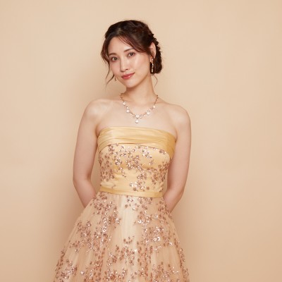 小花の様に立体的に散りばめられたスパンコール装飾が煌めく、優しくやわらかなバニラゴールドカラーのボリュームチュールドレス。着脱可能な肩紐で表情を変えた着こなしも可能です。キラキラと華やかに光りますが、落ち着いた優しい色合いなので派手過ぎない印象でお召しいただけます。