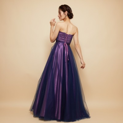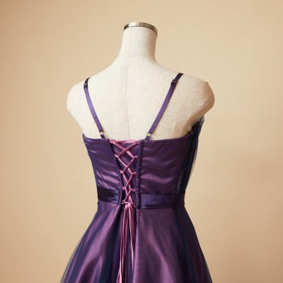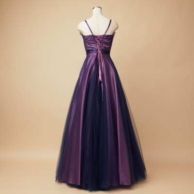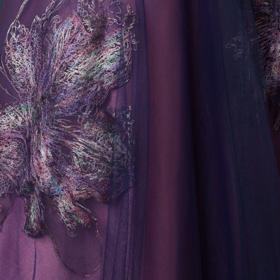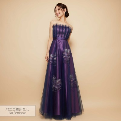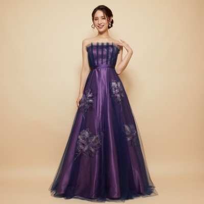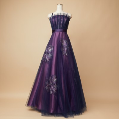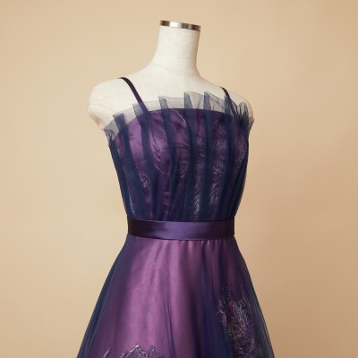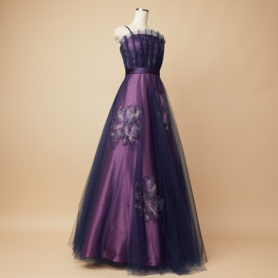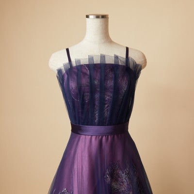 繊細に編み込まれたフラワーモチーフレース装飾を施した、すっきりシルエットのチュールフレアドレス。デザインのポイントとなる胸元のタックフリルは、凛とした大人な雰囲気の中に柔らかな可愛らしさをプラスします。パープルカラーのサテン生地の上にディープネイビーカラーのチュールを合わせた、秋冬らしいシックなグラデーションカラー。