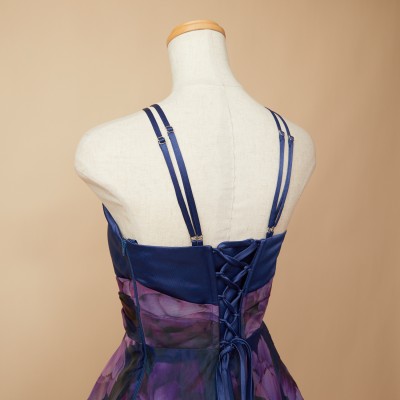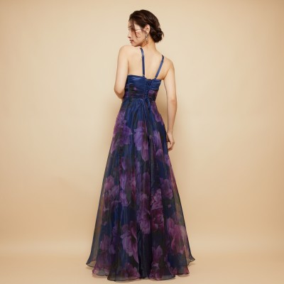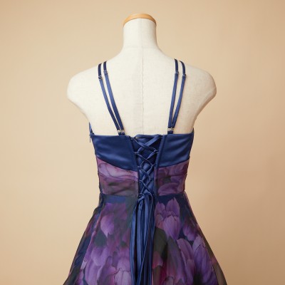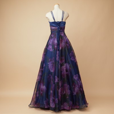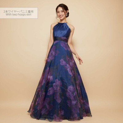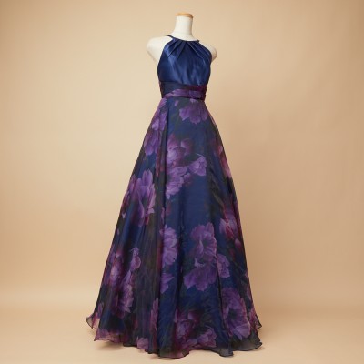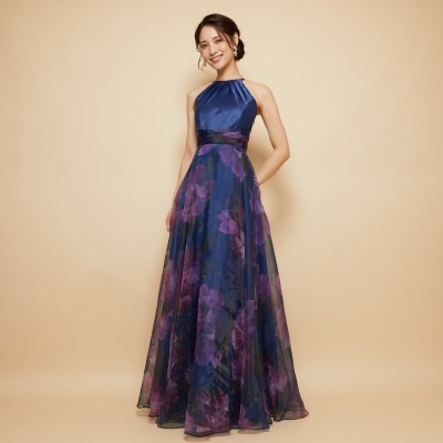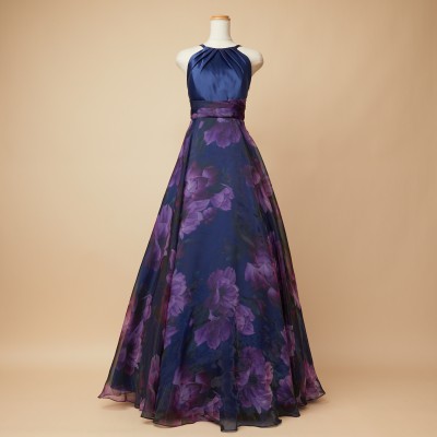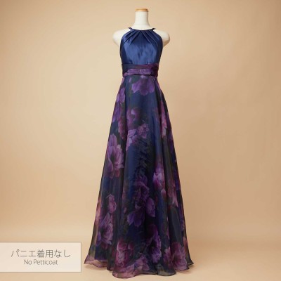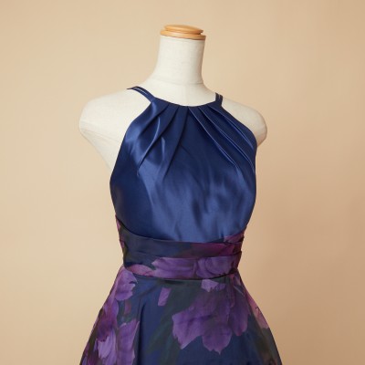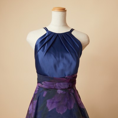 上品なネイビーカラーを基調としたホルターネック風スタイルのステージドレス。落ち着いたトーンのローズピンクフラワーをプリントした艶ありオーガンジースカートは、大人可愛いエレガントな印象に。パニエを使用してふんわりとスカートを広げて着用いただけるとグッと華やいだ雰囲気になります。肩紐が落ちにくいデザインなので、ピアノやバイオリンの演奏におすすめです。