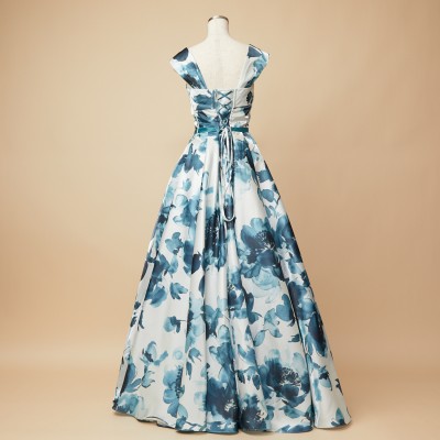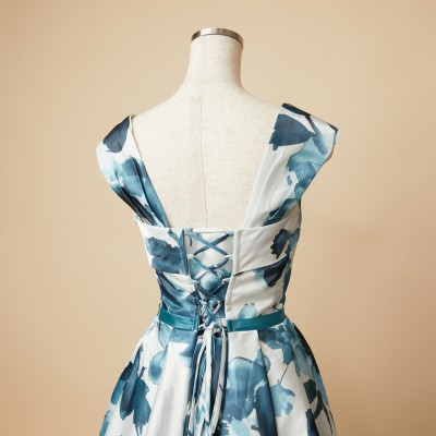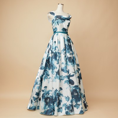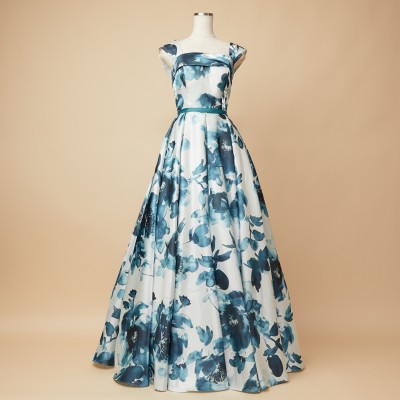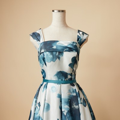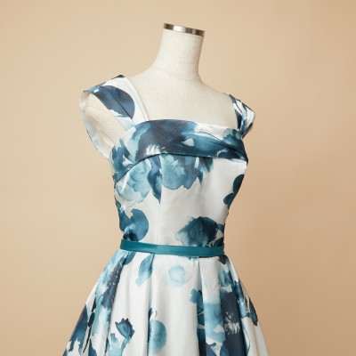 ホワイトカラーの煌めきシャイニーサテンに浮かび上がる、ブルーグリーンフラワーの儚げな模様が幻想的なステージドレス。タックスカートの程よいボリューム感と幅広の肩紐がとても可愛らしいデザインです。肩紐は着脱式なので、肩紐を外して大人っぽく着こなすことも。パニエでスカートをふんわり大きく広げたり、パニエを使わずそのまま可憐なイメージなど、演奏曲に合わせて様々な表現が可能です。