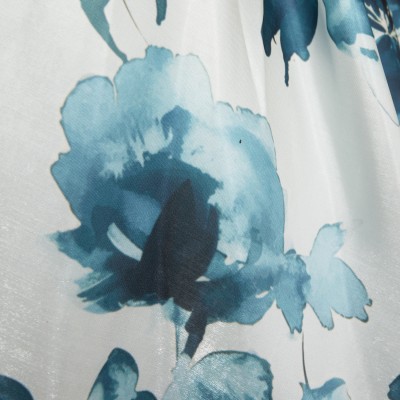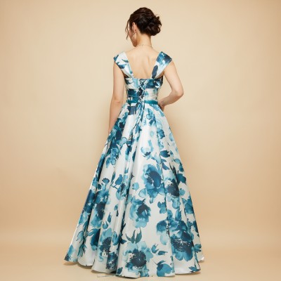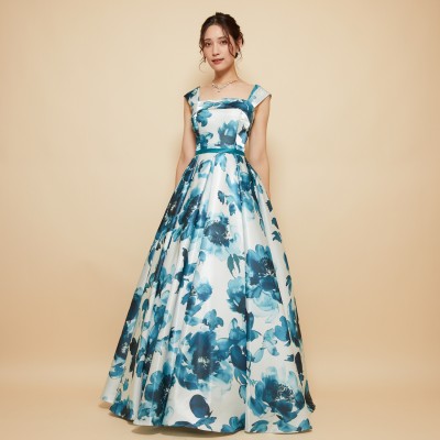 シャイニーサテンブルーグリーンフラワープリントドレス