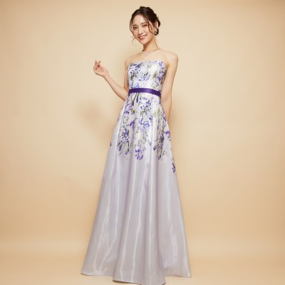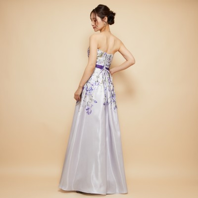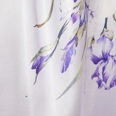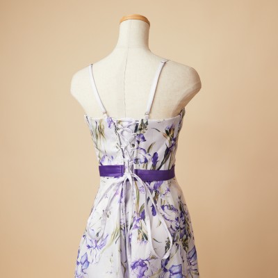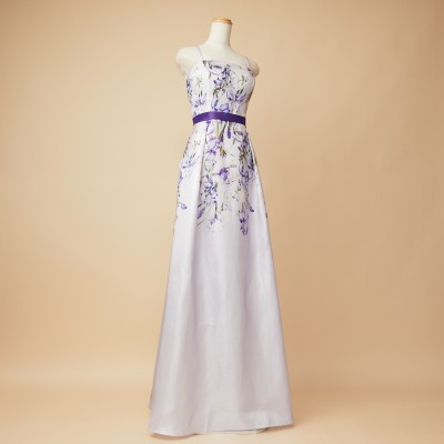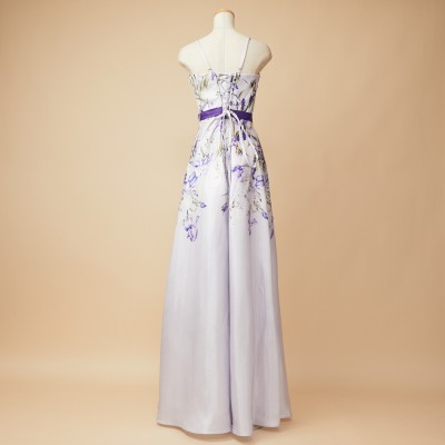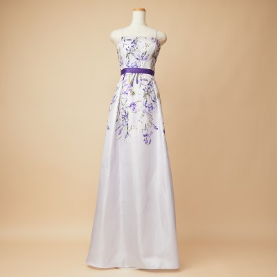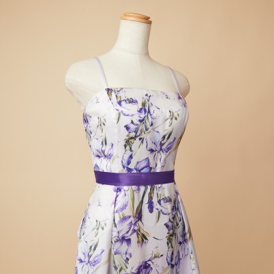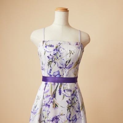 ホワイトベースの艶ありシャイニーサテンに、上品なブルーパープルのアイリスをプリントしたスレンダーラインドレス。滑らかで美しい光沢のサテン生地は高級感がありとてもエレガント。スレンダーなすっきりとしたシルエットのドレスなので、パーティードレスとしてもおすすめです。