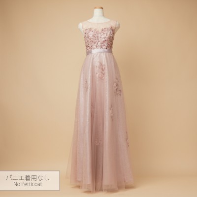 控えめで柔らかなスモーキーカラー刺繍が大人可愛いチュールレースドレス。すっきりとフィットしたウエストラインから、ふわりと緩やかに広がるチュールスカートのナチュラルなAラインスタイルです。レース生地にあしらわれたクリアスパンコールの繊細なきらめきはエレガントさプラスします。年齢問わず人気のくすみ系ピンク、落ち着いた印象のダスティローズカラー。