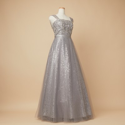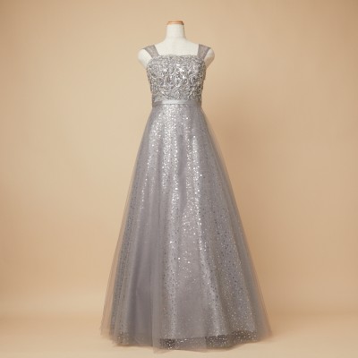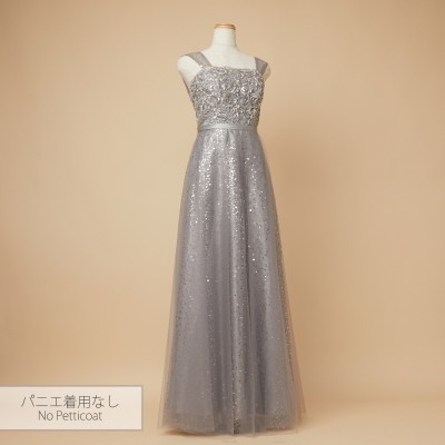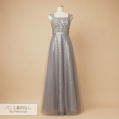 アンティークなシルバーグレーカラーのチュールフレアドレス。ビーズやスパンコールの装飾をふんだんにあしらった、胸元の豪華な装飾の煌びやかさに目を惹かれます。スカートにもビーズやスパンコールの華やかな装飾があるので、パニエを使ってスカートを広げた着こなしがお勧めです。