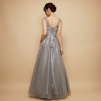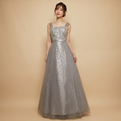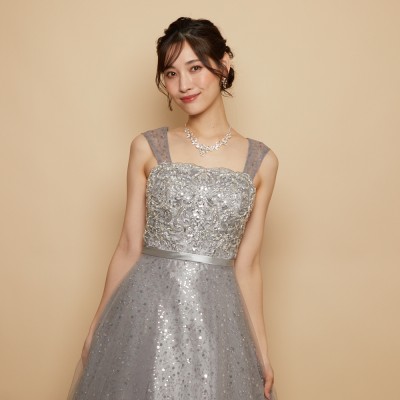 アンティークなシルバーグレーカラーのチュールフレアドレス。ビーズやスパンコールの装飾をふんだんにあしらった、胸元の豪華な装飾の煌びやかさに目を惹かれます。スカートにもビーズやスパンコールの華やかな装飾があるので、パニエを使ってスカートを広げた着こなしがお勧めです。