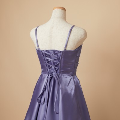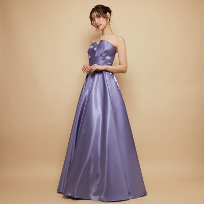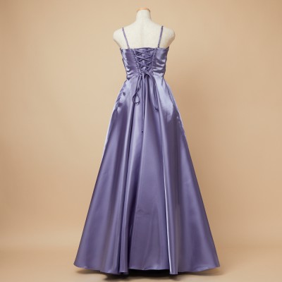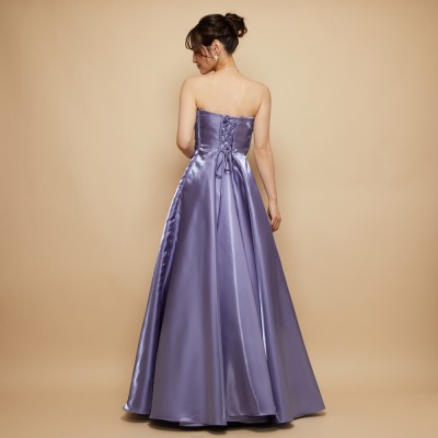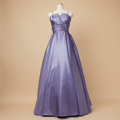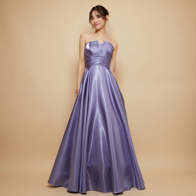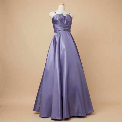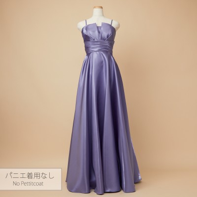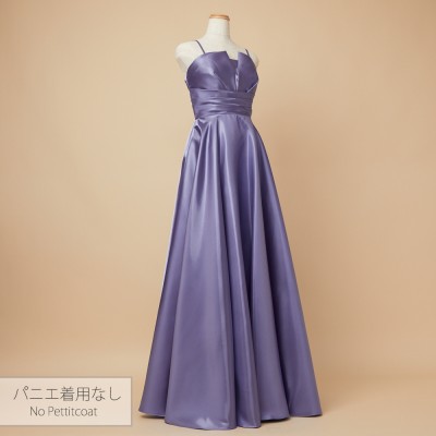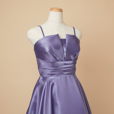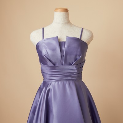 艶やかな光沢が美しいシャイニーサテンを使用したAラインフレアドレス。フィット&フレアのすっきりとしたAラインシルエットに胸元の扇風タックがお洒落ポイントです。ペールトーンの落ち着いたくすみ系パープルグレーカラー。