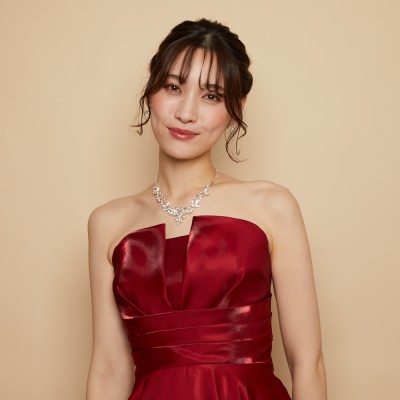 艶やかな光沢が美しいシャイニーサテンを使用したAラインフレアドレス。フィット&フレアのすっきりとしたAラインシルエットに胸元の扇風タックがお洒落ポイントです。りんご飴のように透明感のある艶やかな深紅が魅力のキャンディレッドカラー。