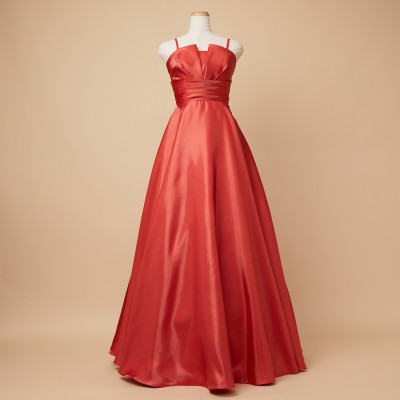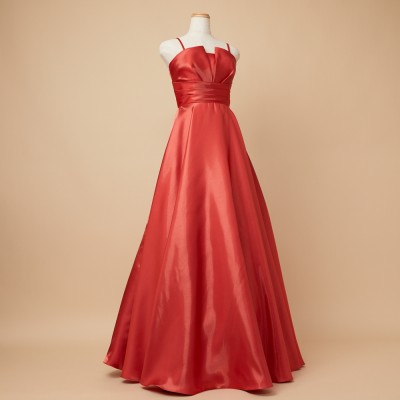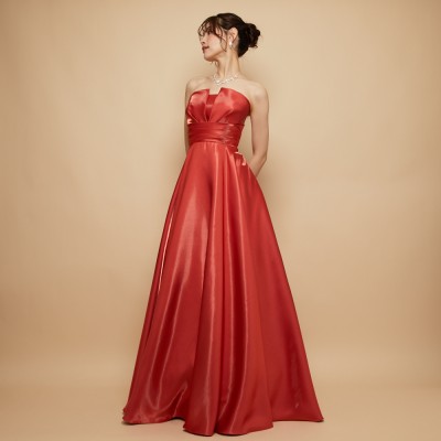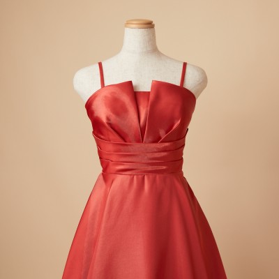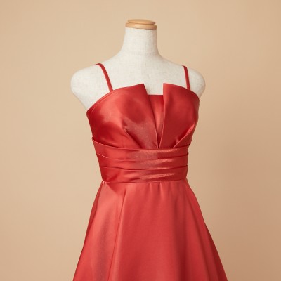 艶やかな光沢が美しいシャイニーサテンを使用したAラインフレアドレス。フィット&フレアのすっきりとしたAラインシルエットに胸元の扇風タックがお洒落ポイントです。一段と明るく華やかな印象になる、ビビッドなブラッドオレンジカラー。