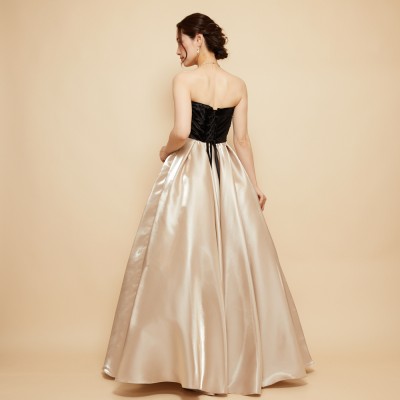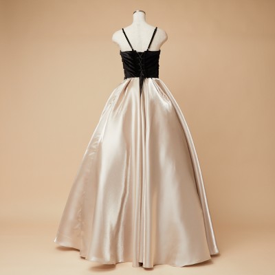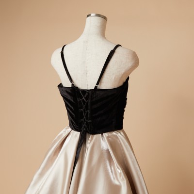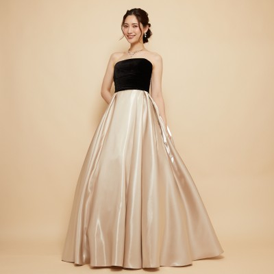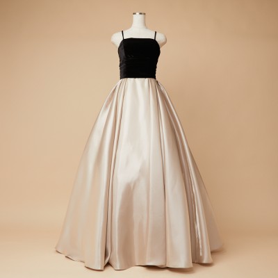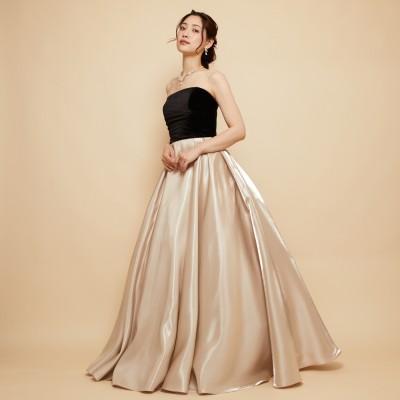 ベロア×サテンの異素材を使用した、ふんわりボリュームタックスカートドレス。ブラックカラーのベロア素材に、艶々光沢のシャイニーサテン生地のボリュームスカート。異素材&バイカラーのデザイナーいち押しの洒落なデザインです。ミルクたっぷりのクリーミーカフェラテをイメージした、優しさ溢れる上品なラテカラーです。