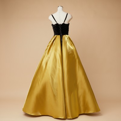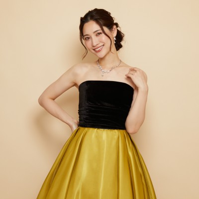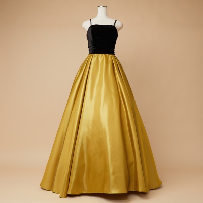 ベロア×サテンの異素材を使用した、ふんわりボリュームタックスカートドレス。ブラックカラーのベロア素材に、艶々光沢のシャイニーサテン生地のボリュームスカート。異素材&バイカラーのデザイナーいち押しの洒落なデザインです。花嫁様にも大人気!個性的で大人なマスタードカラー。
