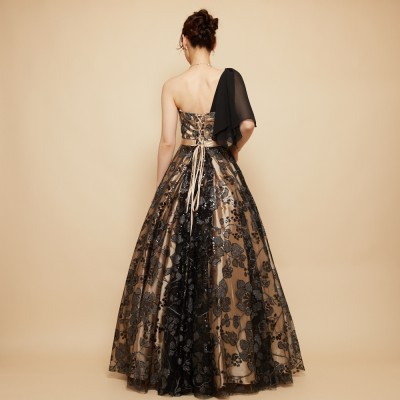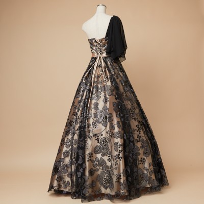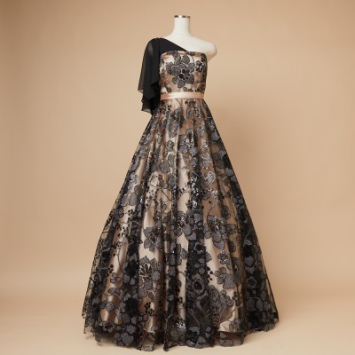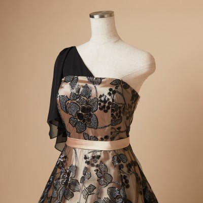 ブラックベージュワンショルダーデザインフラワー刺繍ドレス