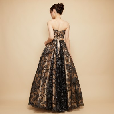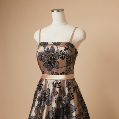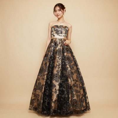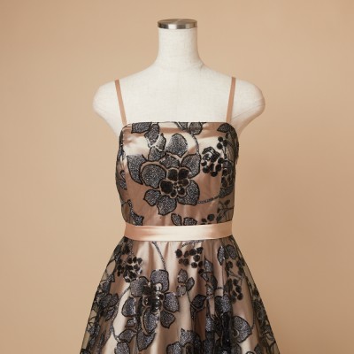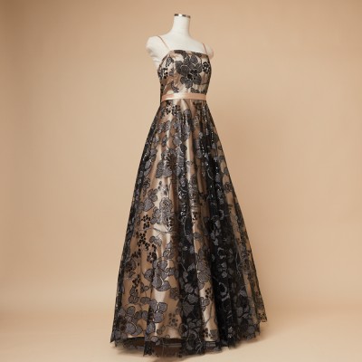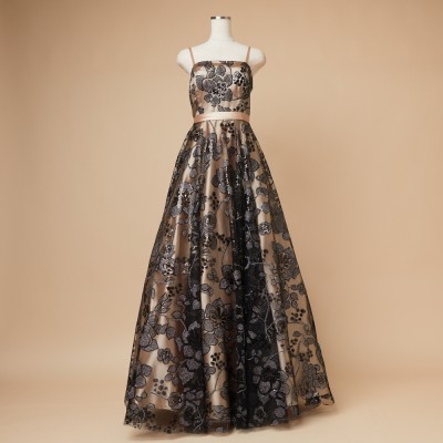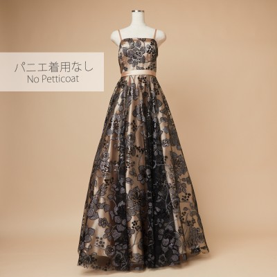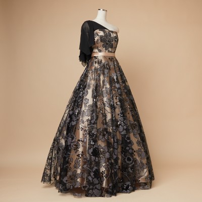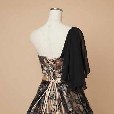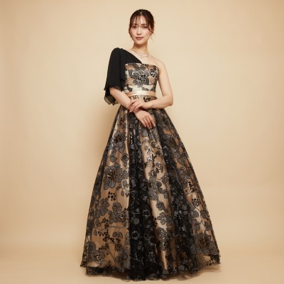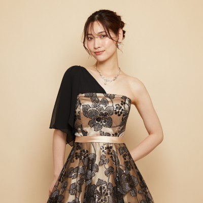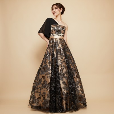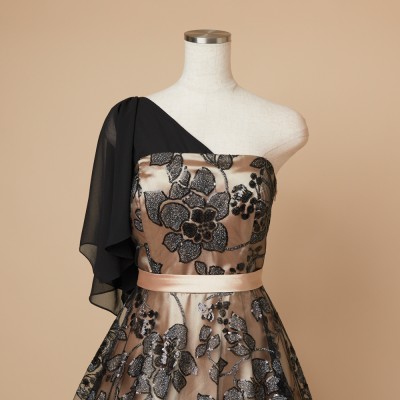 ゴールドベージュカラーにブラックフラワースパンコール刺繍チュールを重ねた、個性派Aラインフレアドレス。ワンショルダードレスとしても着用可能な、着脱式ブラックカラーシフォンフレアショルダーが付属。身頃は、肩紐のみ・ワンショルダー・ベアトップの3wayでの着こなしが可能なので、ぜひお好みのスタイルでご着用ください!