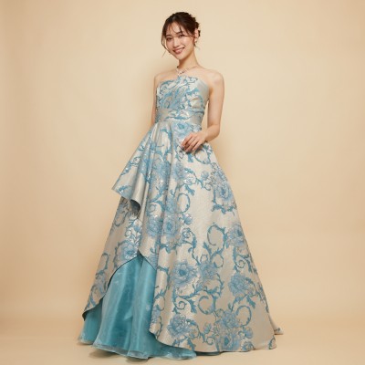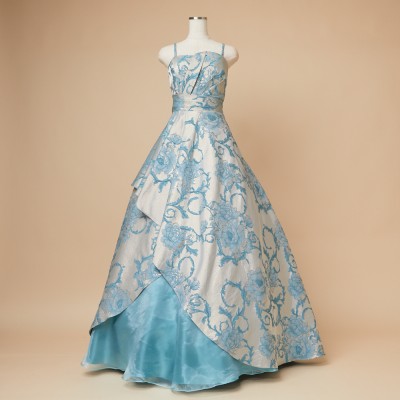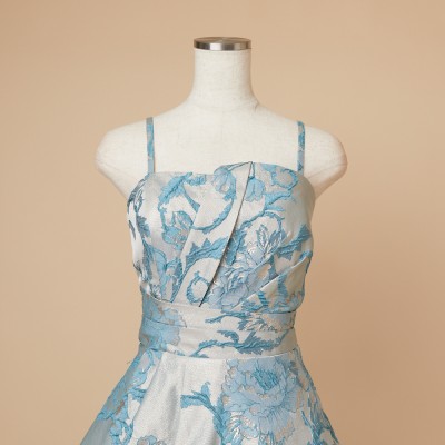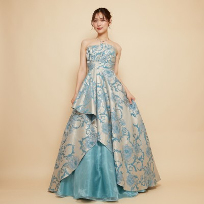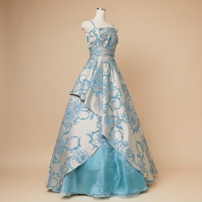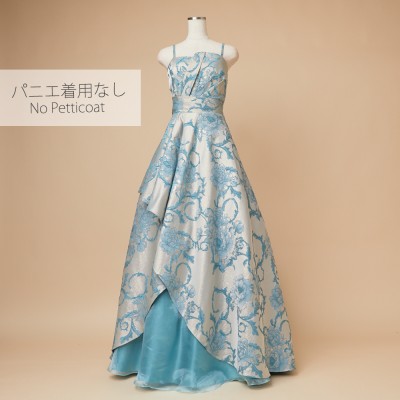 どこか荘厳な雰囲気を感じさせるジャガード生地を贅沢に使用したボリュームドレス。パニエでさらにボリュームアップして、スカートのレイヤースタイルを生かした着こなしがおすすめ。ゴールドベージュのベースカラーにティールグリーンの差し色が華やかなステージドレスです。