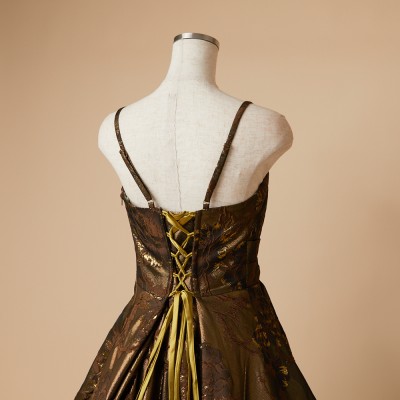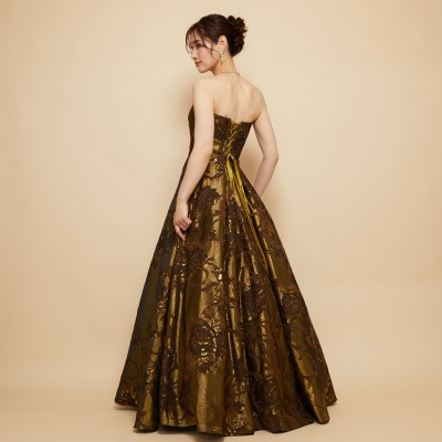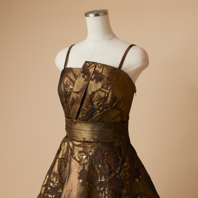 どこか荘厳な雰囲気を感じさせる華やかジャガード生地を贅沢に使用したボリュームドレス。オリーブブラウンのエキゾチックなカラーリングが個性的でミステリアスな印象に。パニエでさらにボリュームアップして、スカートのレイヤースタイルを生かした着こなしがおすすめです。
