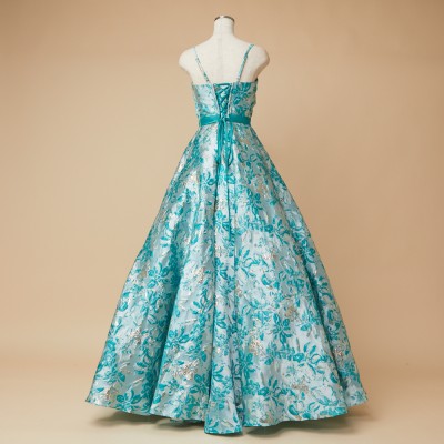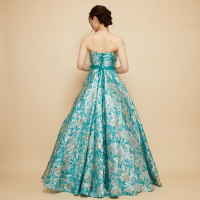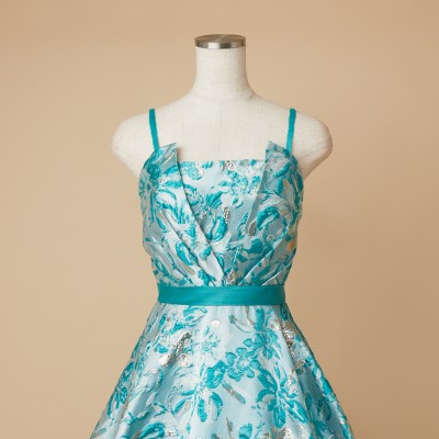 エメラルドブルー総柄ジャガードAラインフレアドレス