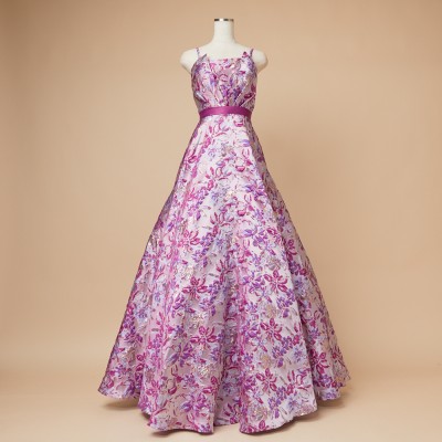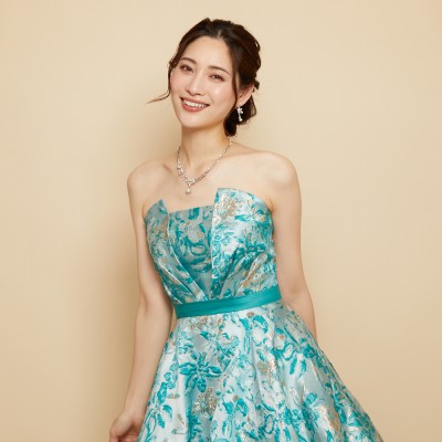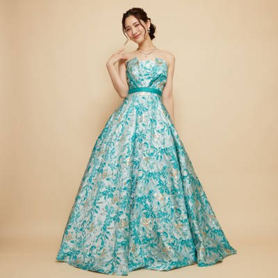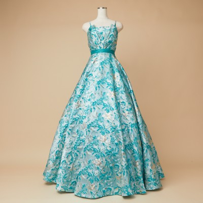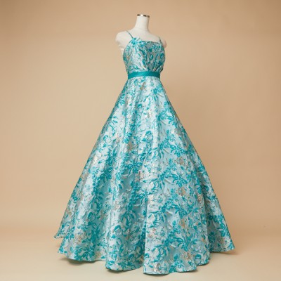 エメラルドブルーの美しい色合いが映える、ウエストラインのきゅっと締まったAラインフレアドレス。ゴールドのラメ糸が混ざった豪華な総柄ジャガード生地をたっぷり使った、贅沢な広がりのフレアスカートがポイントです。硬い生地の多いジャガードですが、こちらはふんわりとした優しい手触りが特徴。ぱっと華やかな色合いの3色展開なので、トリオ演奏等お色違いで揃えてのご着用もおすすめです!