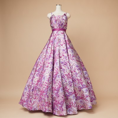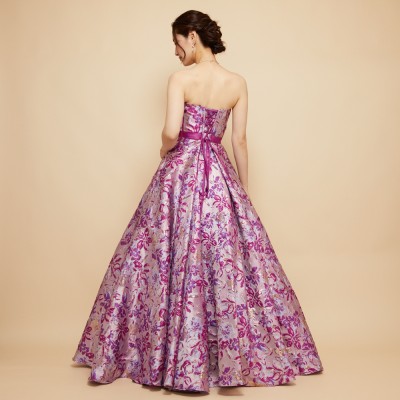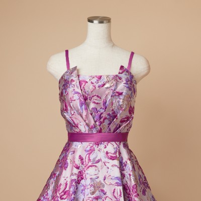 ぱっと華やぐ色彩のマゼンタカラーが目を惹く、ウエストラインのきゅっと締まったAラインフレアドレス。ゴールドのラメ糸が混ざった豪華な総柄ジャガード生地をたっぷり使った、贅沢な広がりのフレアスカートがポイントです。硬い生地の多いジャガードですが、こちらはふんわりとした優しい手触りが特徴。華やかな色合いの3色展開なので、トリオ演奏等お色違いで揃えてのご着用もおすすめです!