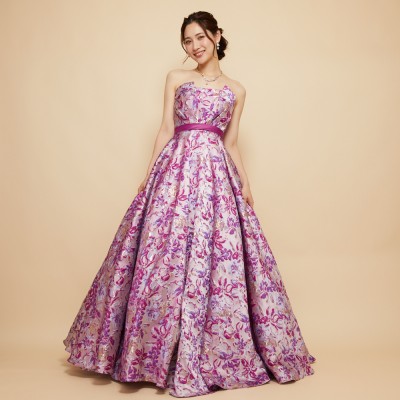 マゼンタカラー総柄ジャガードAラインフレアドレス