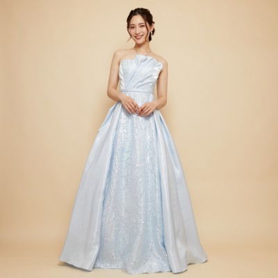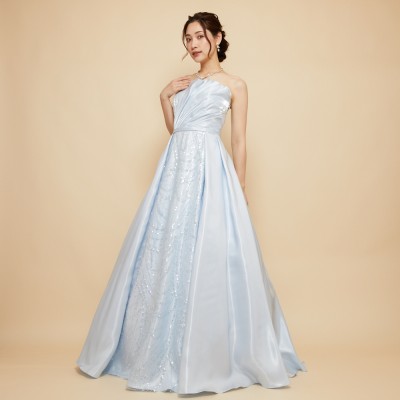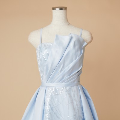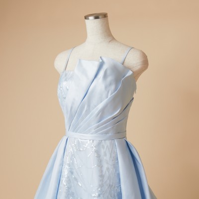 澄み切った雪解け水のようなアイスブルーカラーの艶やかな光沢が美しいシャイニーサテンフレアドレス。上品な淡いカラーリングに、華やかな胸元のフリルタックがワンポイント。スカートのセンター部分には、水面に反射する木漏れ日が波紋のように連なったクリアスパンコール装飾生地を使用。控えめながらもキラキラとしたエレガントな輝きも魅力です。