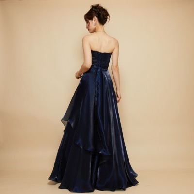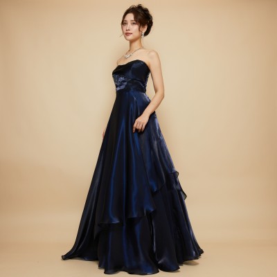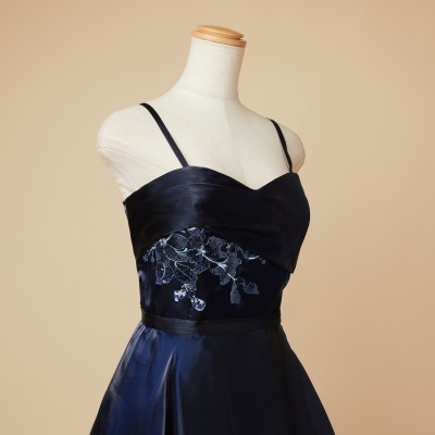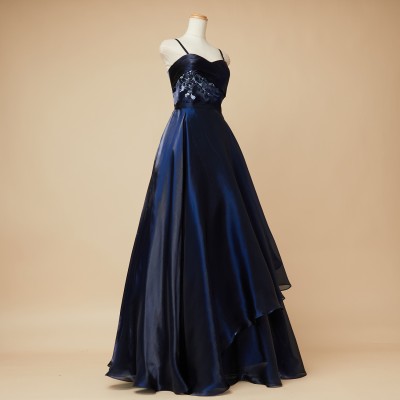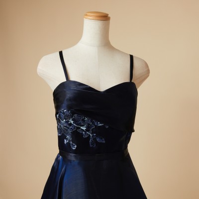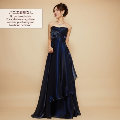 艶やかな光沢のディープネイビーカラーサテン生地を使用した、アシンメトリーレイヤースカートドレスです。胸元のさりげないスパンコール刺繍がデザインのアクセント。比較的重さの無い軽やかなサテンなので、パニエでスカートを広げれば美しいAラインドレスとしてもご着用いただけます。