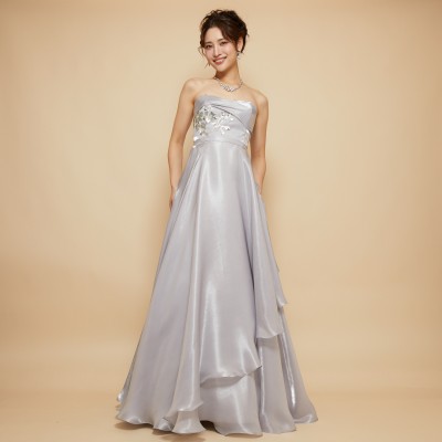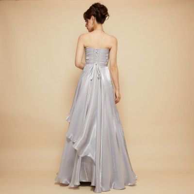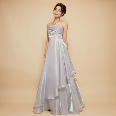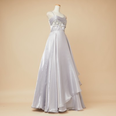 艶やかな光沢のシルバーカラーサテン生地を使用した、アシンメトリーレイヤースカートドレスです。胸元のさりげないスパンコール刺繍がデザインのアクセント。比較的重さの無い軽やかなサテンなので、パニエでスカートを広げれば美しいAラインドレスとしてもご着用いただけます。