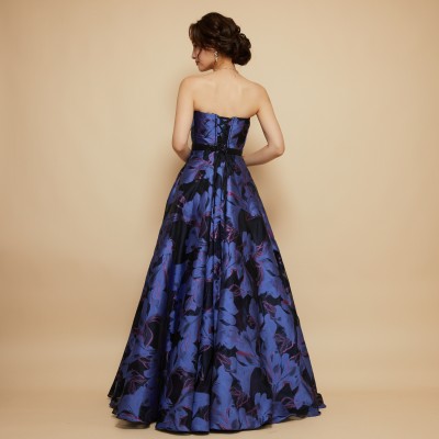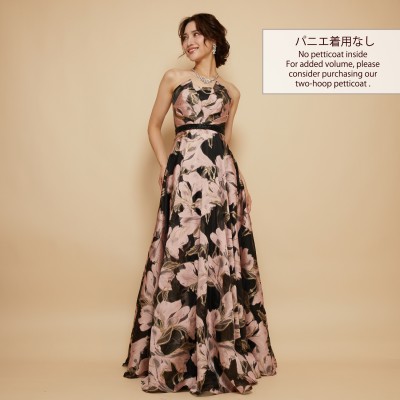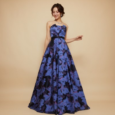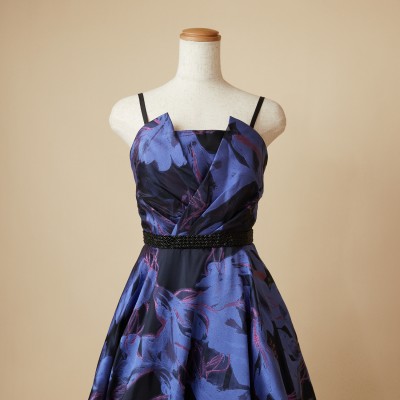 ネイビー×ブラックの抽象的な花柄ジャガード生地をふんだんに使用したフレアスカートのAラインドレス。柄のポイントにビビッドピンクカラーのラメ糸を折り込んだシックなカラーでも個性的で華のあるデザインが魅力です。繊細な輝きを放つウエストの細かなブラックビーズベルトがアクセントに。パニエ無しでスタイリッシュな印象に、パニエを使用すればフレアスカートが大きく広がり豪華な雰囲気に早変わり。初めてドレスを着る方にもおすすめ出来るステージドレスです。