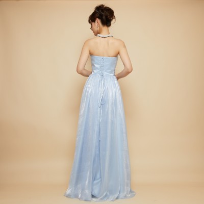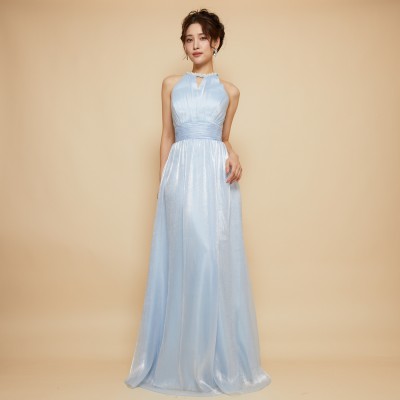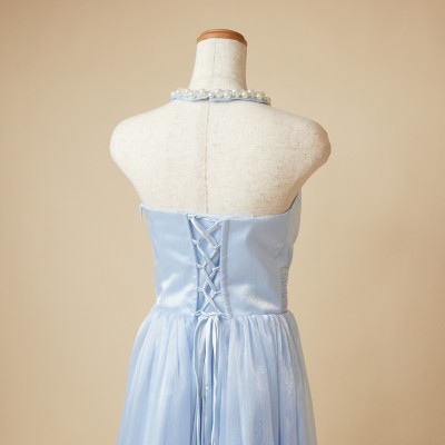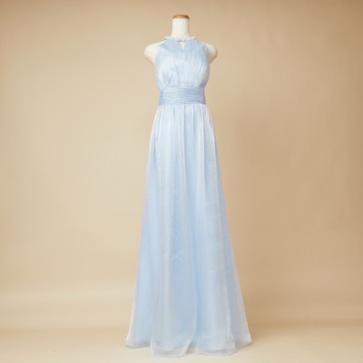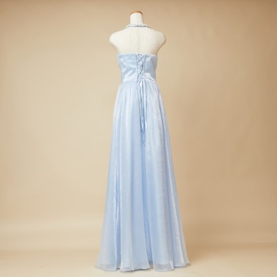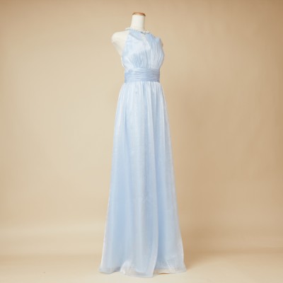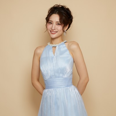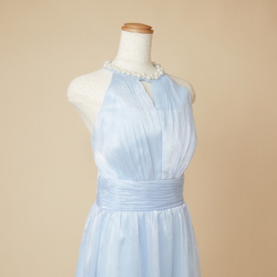 首元に華やかなボリュームのあるパールを連ねた、清楚なライトブルーカラーのホルターネックスタイルドレス。さらっと軽いワッシャー加工オーガンジーの個性的な風合いとペールトーンの落ち着いたカラーがとても上品な雰囲気です。