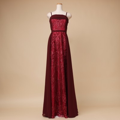 絵画の様なクラシカルゴールドレースが目を惹くスレンダーラインドレス。さらりとしたシフォン生地が揺れる、エレガントな立ち姿が魅力です。深みのあるバーガンディーカラーのシフォンに、少し明るめなワインレッドのレースが華やかに浮かび上がるコントラストの美しいモノクロマティックカラー。