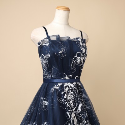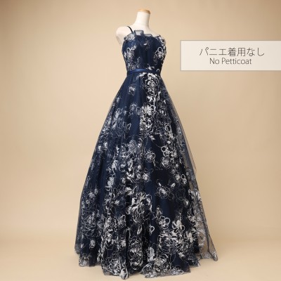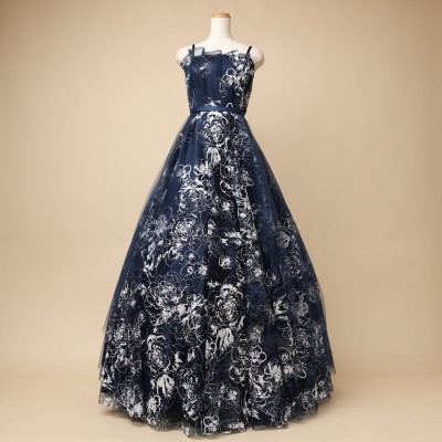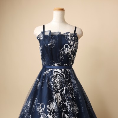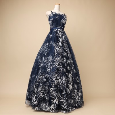 フロストシュガーの様な立体感のあるホワイトグリッターを使用した、ラグジュアリーボリュームチュールドレスです。抽象的なフラワー模様が大人っぽくエレガントな印象に。グリッターの華やかな輝きを引き立たせる、シックで上品なネイビーカラー。