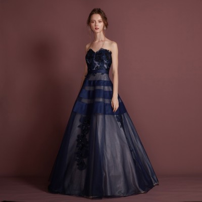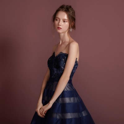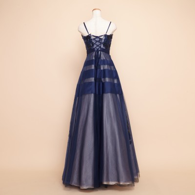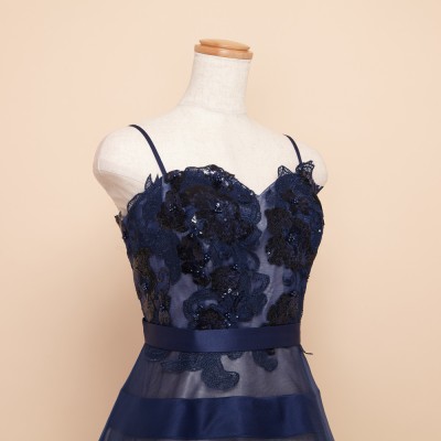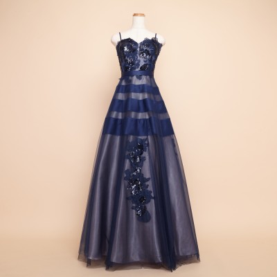 すっきりとしたAラインにお洒落なボーダーをデザインし、胸元とスカートには煌びやかなスパンコール刺繍を贅沢にあしらったステージドレス。裏地にはシャンパンベージュカラーのサテン生地を使用し、各所のデザインが浮かび上がるよう配色にもこだわりました。シックなカラー展開なので、パーティドレスとしても使いやすいドレスです。ソロ演奏など目立ちたい方にはこちらのネイビーカラーがおすすめ!華やかなアクセサリーを合わせて個性的に着こなしましょう。