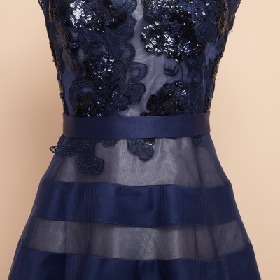 【OUTLET】ボーダーデザインスパンコール刺繍ネイビードレス