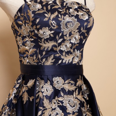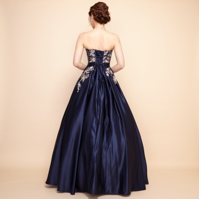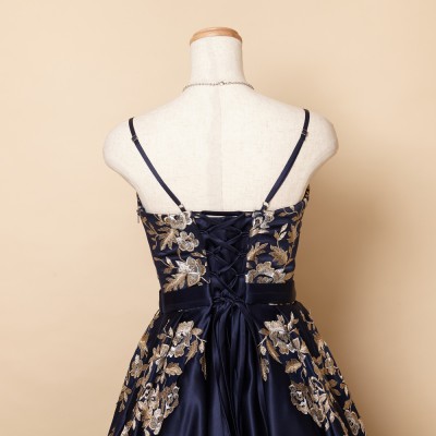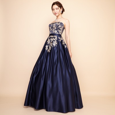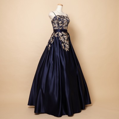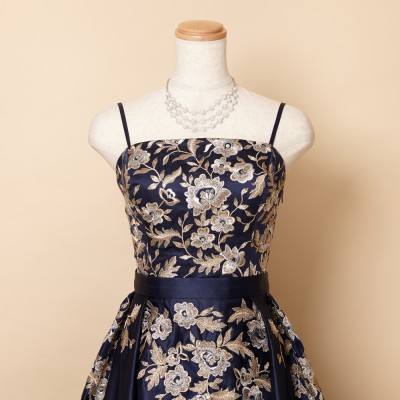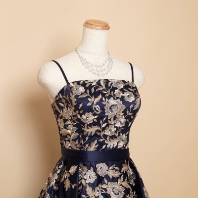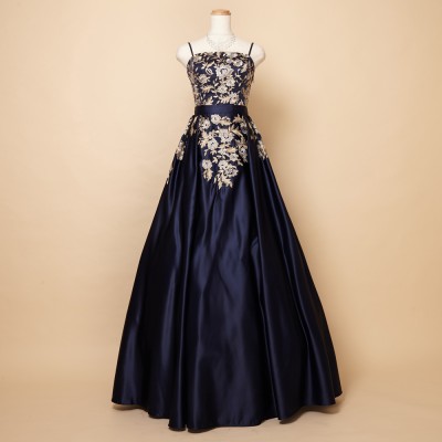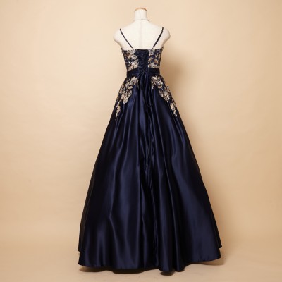 上半身に金糸と銀糸を贅沢に使用した豪華なフラワー刺繍が印象的な気品あるステージドレス。マットな生地の光沢とパニエ無しでも大きく広がるボリューミーなスカートが、よりドレスの高級感を引き立てます。シックなネイビーに良く映える金糸と銀糸はとても華やかです。