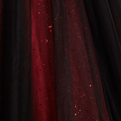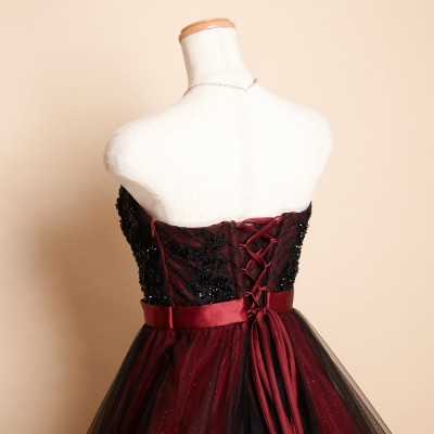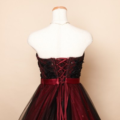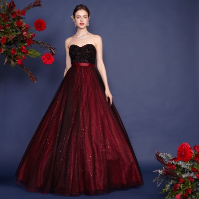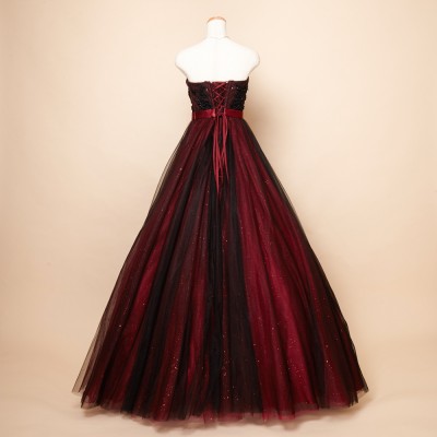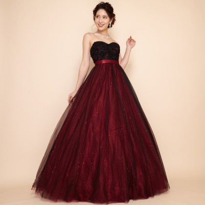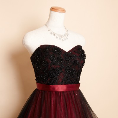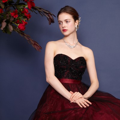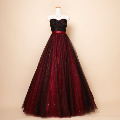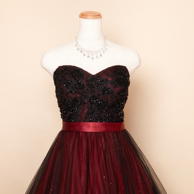 シックなワインカラーにブラックチュールを合わせた大人の女性のためのドレス。スカートにはキラキラと輝く深紅のグリッターを散りばめました。ブラック×ワインのダークなカラーですが、ボリュームあるスカートと胸元のビーズ刺繍がとてもエレガントなドレスです。秋冬や夜の時間帯の演奏会ドレスとしておすすめです。