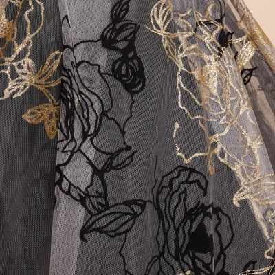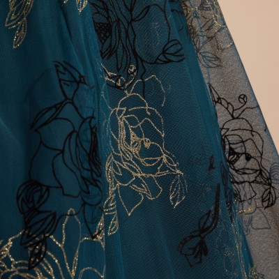 Green Tulle Gold-Black Flower Flock Embroidery Gown
